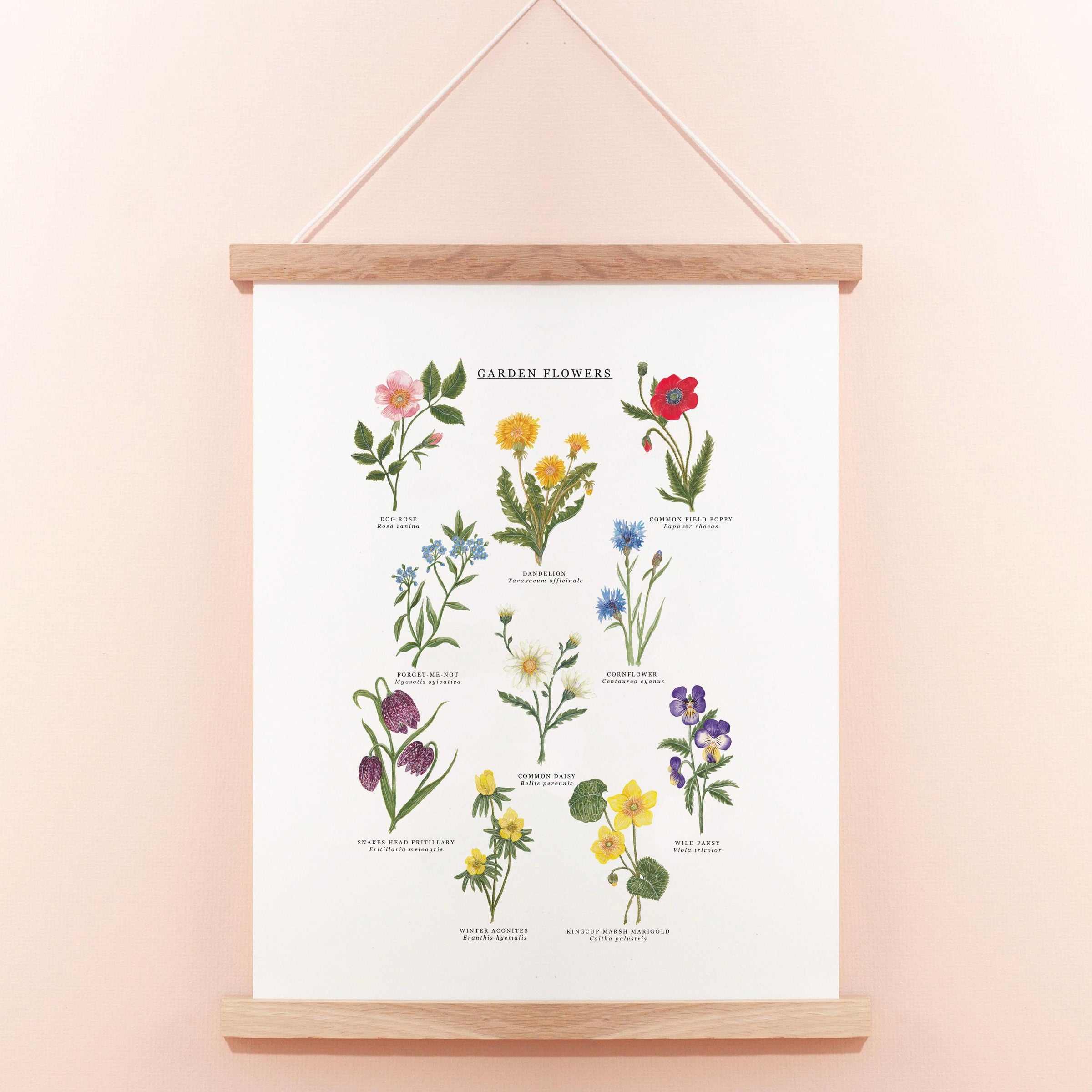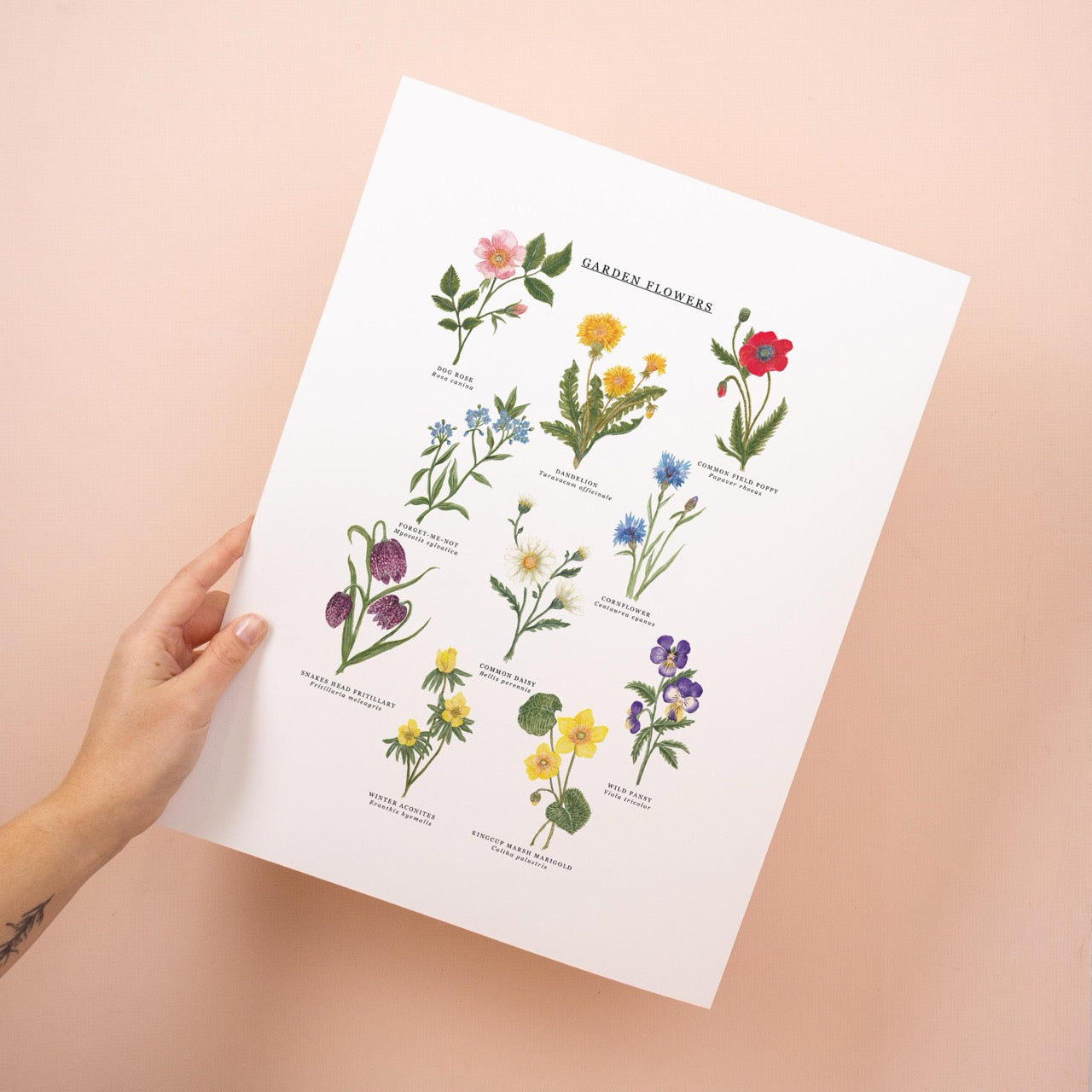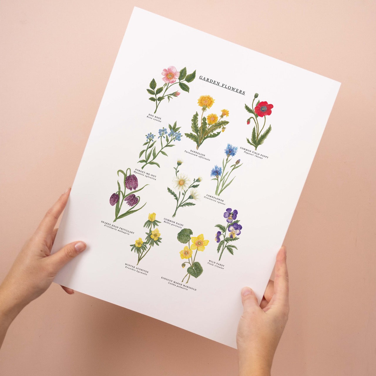 A super colourful, whimsical garden flower print, featuring 10 hand-painted watercolour illustrations of British flowers. The perfect print for nailing that cottagecore aesthetic.