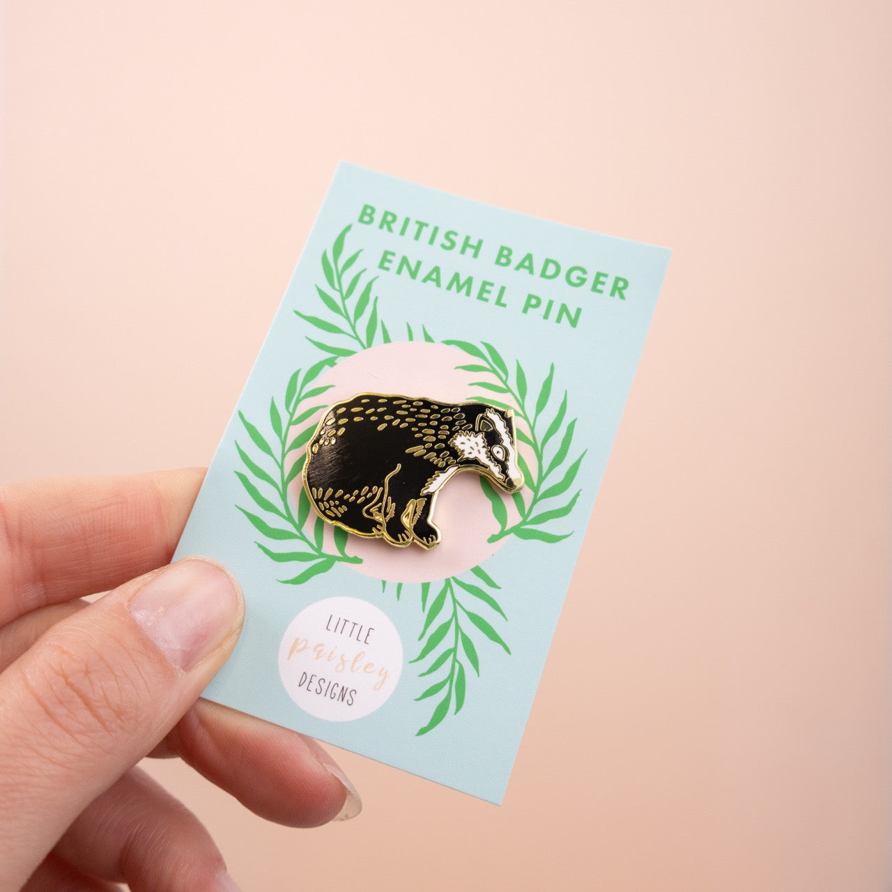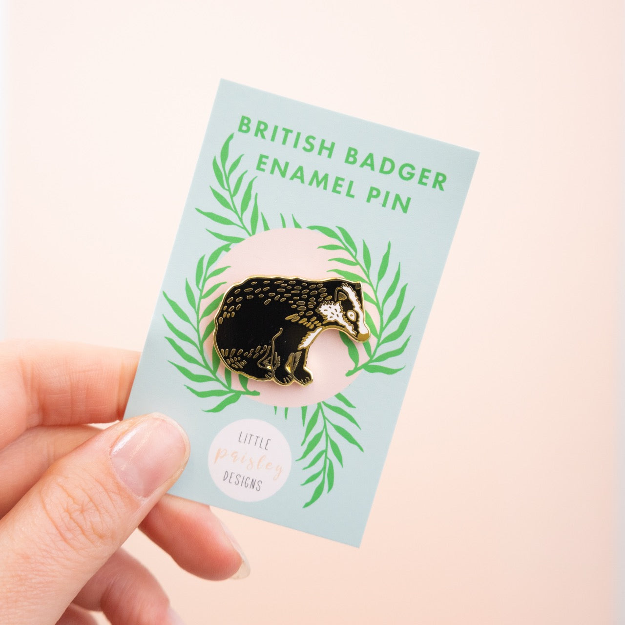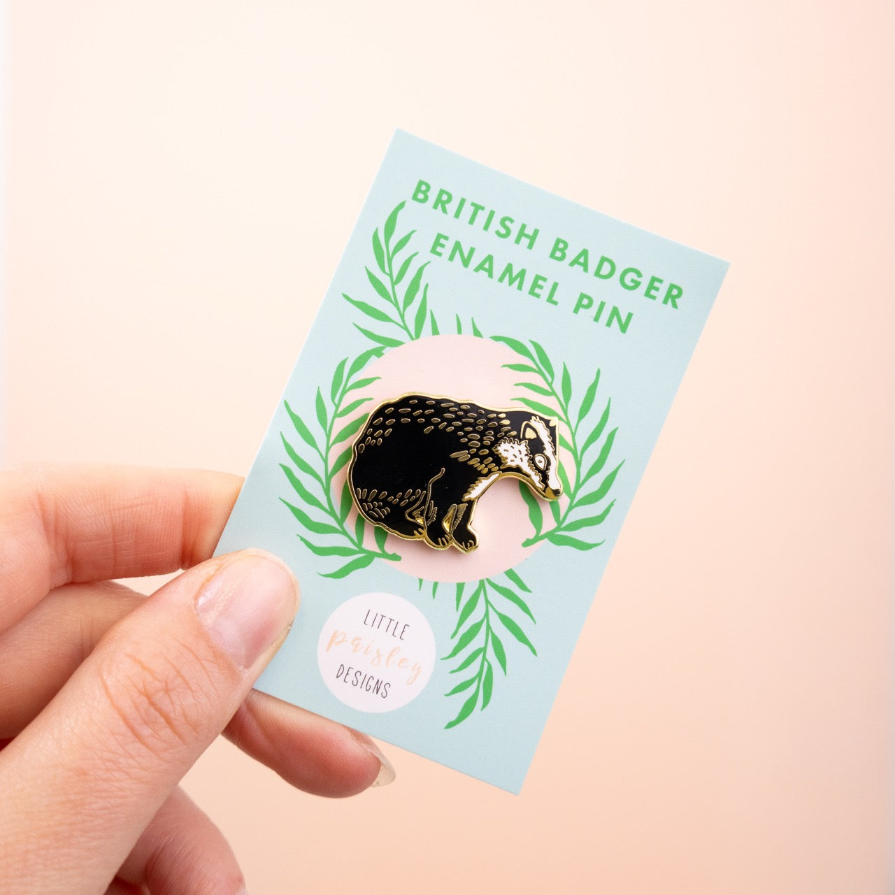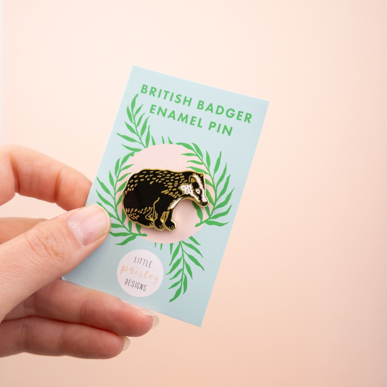 A beautiful British Badger Pin. A hard enamel pin, based on a watercolour illustration of a beautiful British Badger by Illustrator Eleanor Longhurst. Pop it on your collar, bag or coat to jazz up your outfit!