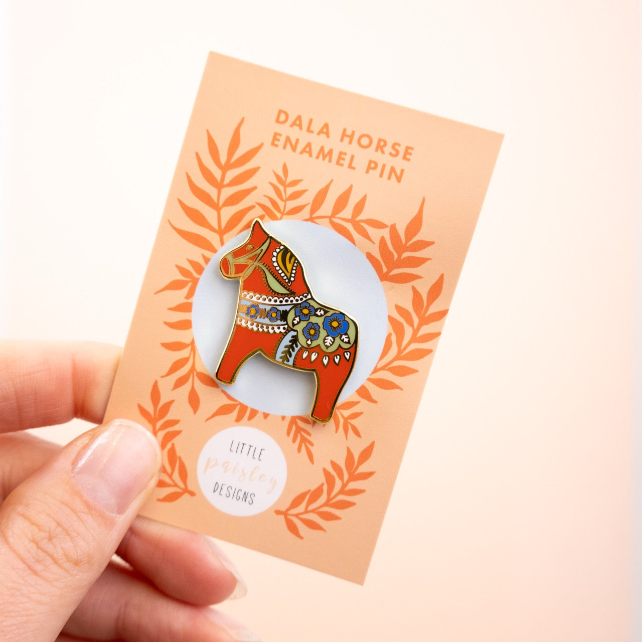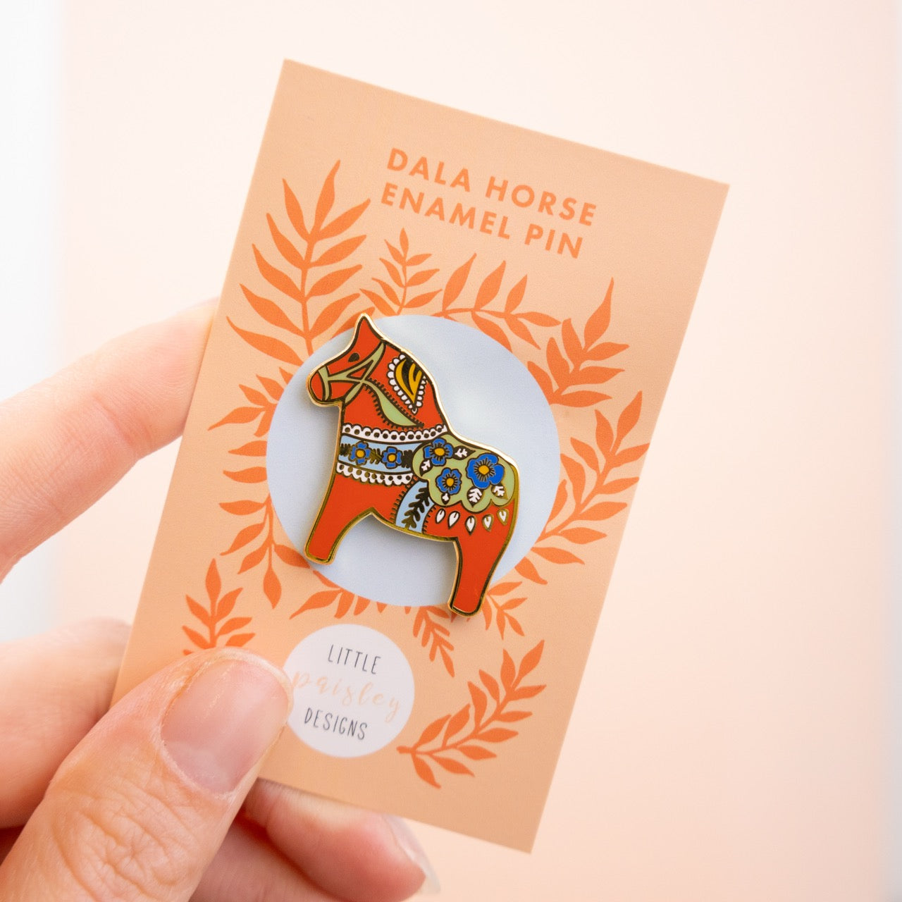 A beautiful scandi Dala Horse Pin with intricate colourful decoration. A hard enamel pin, based on a gouache illustration of a Swedish Dala Horse by Illustrator Eleanor Longhurst. Pop it on your collar, bag or coat to jazz up your outfit!