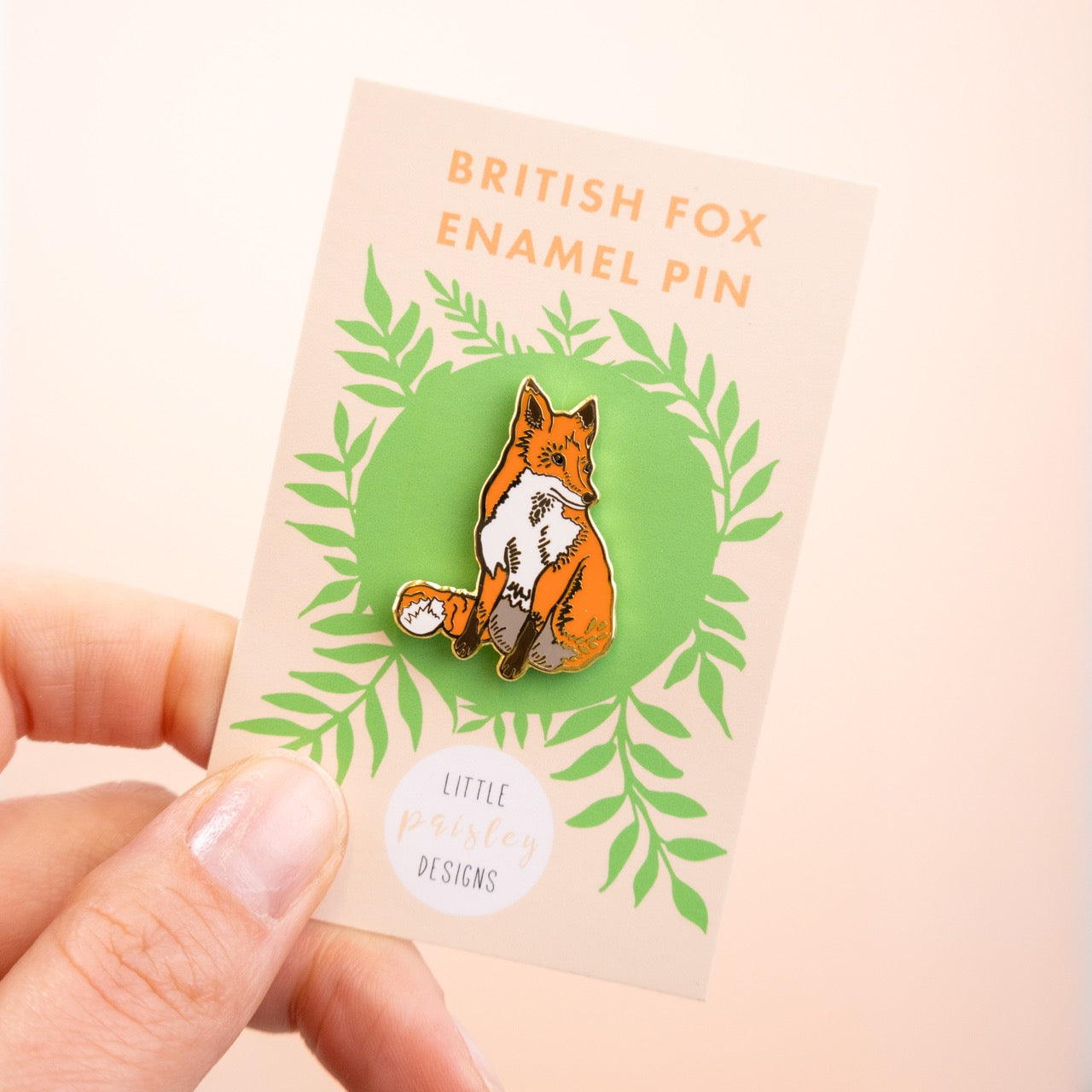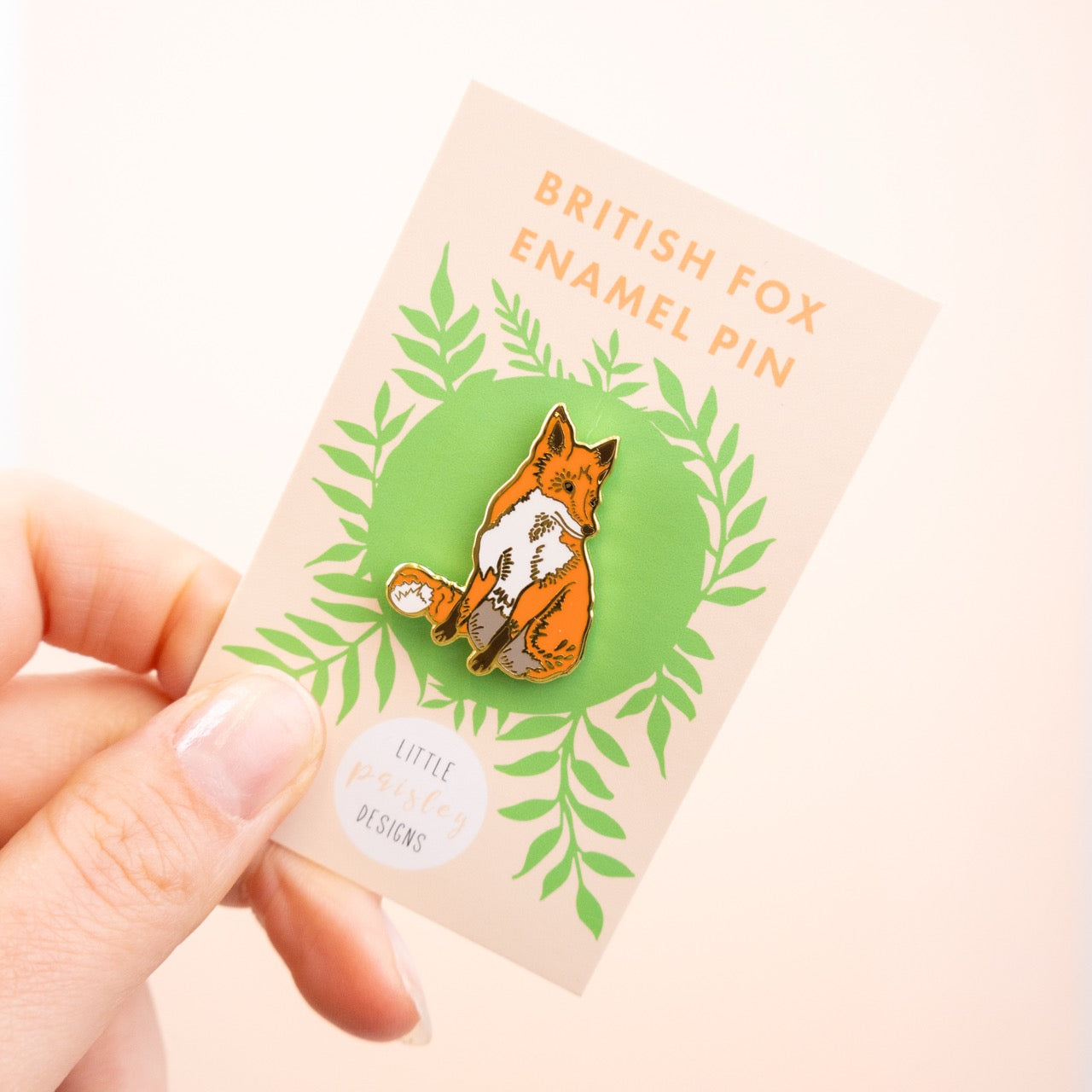 A colourful Fox Pin badge. A hard enamel pin, based on a watercolour illustration of a beautiful British Red Fox by Illustrator Eleanor Longhurst. Pop it on your collar, bag or coat to jazz up your outfit! This Fox pin comprises of striking orange enamel, with gold details, perfect for adding a splash of colour to an outfit.
