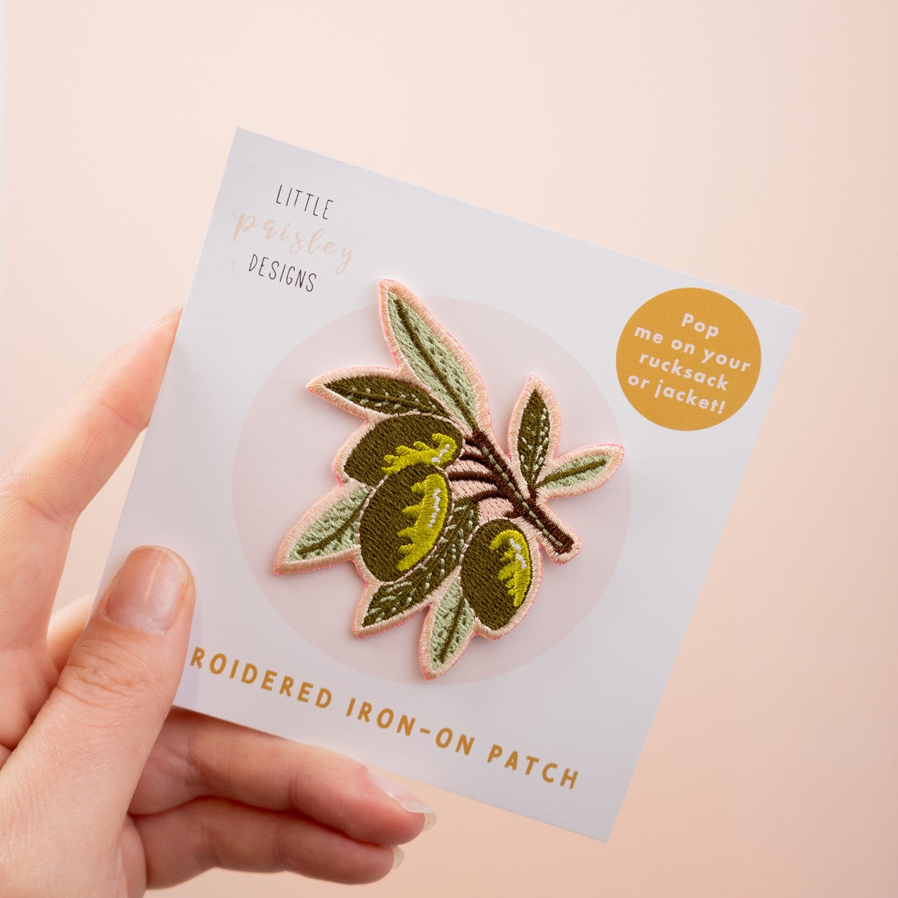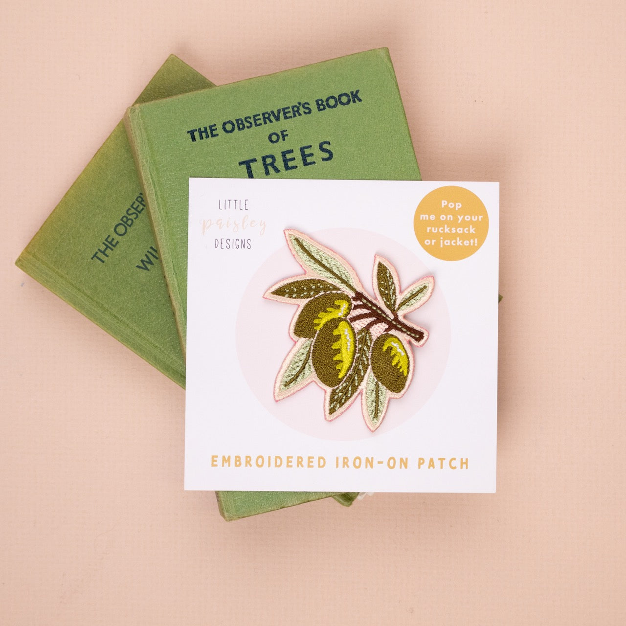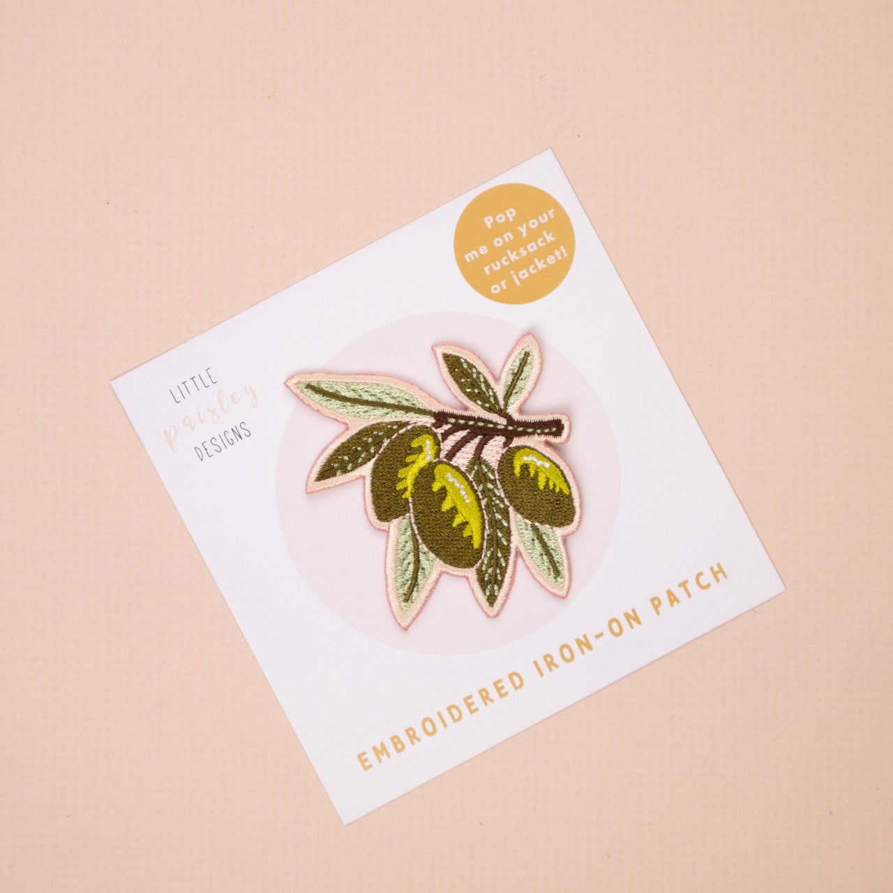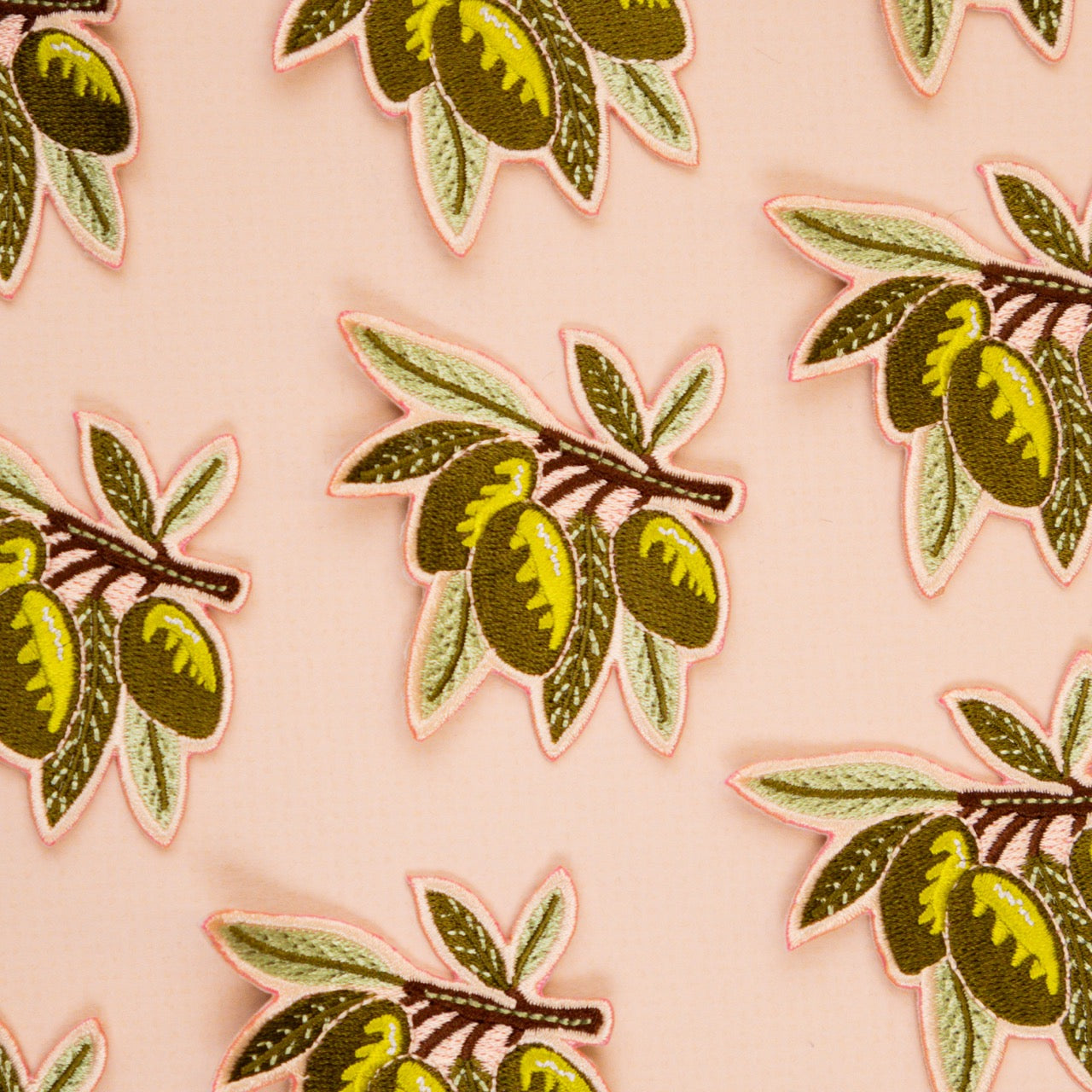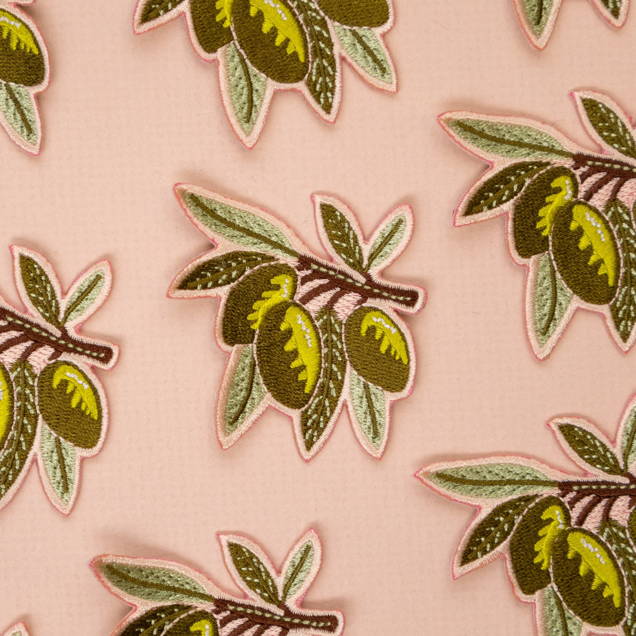 A delicate and colourful Olive embroidered patch. This botanical iron-on patch features a 3 juicy Kalamata olives and leaves with a complementary peachy pink border, which makes it really stand out. This lovely little Olive patch will cheer up a jacket or bag with its delicate embroidered green hues. The design comes from an original watercolour painting by illustrator Eleanor Longhurst from our 2025 botanical calendar. Pop it on a t-shirt, rucksack or jacket to jazz up your outfit! Simply Iron on and the patch will be permanently held in place! Each patch has an adhesive backing, which is secured by ironing on.