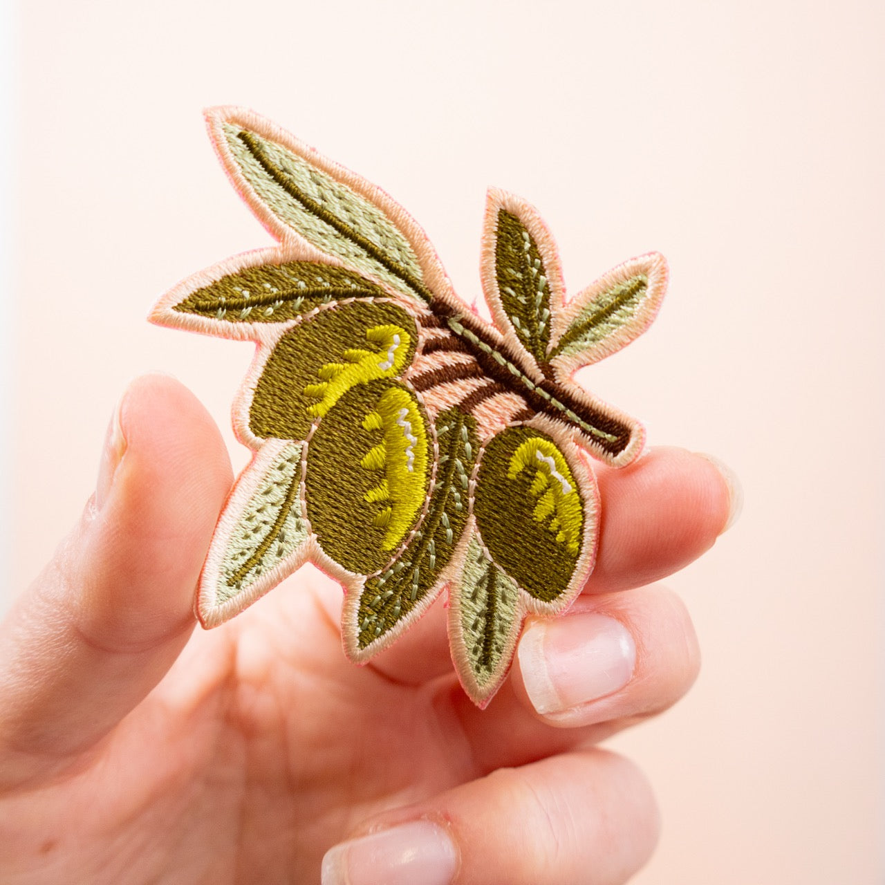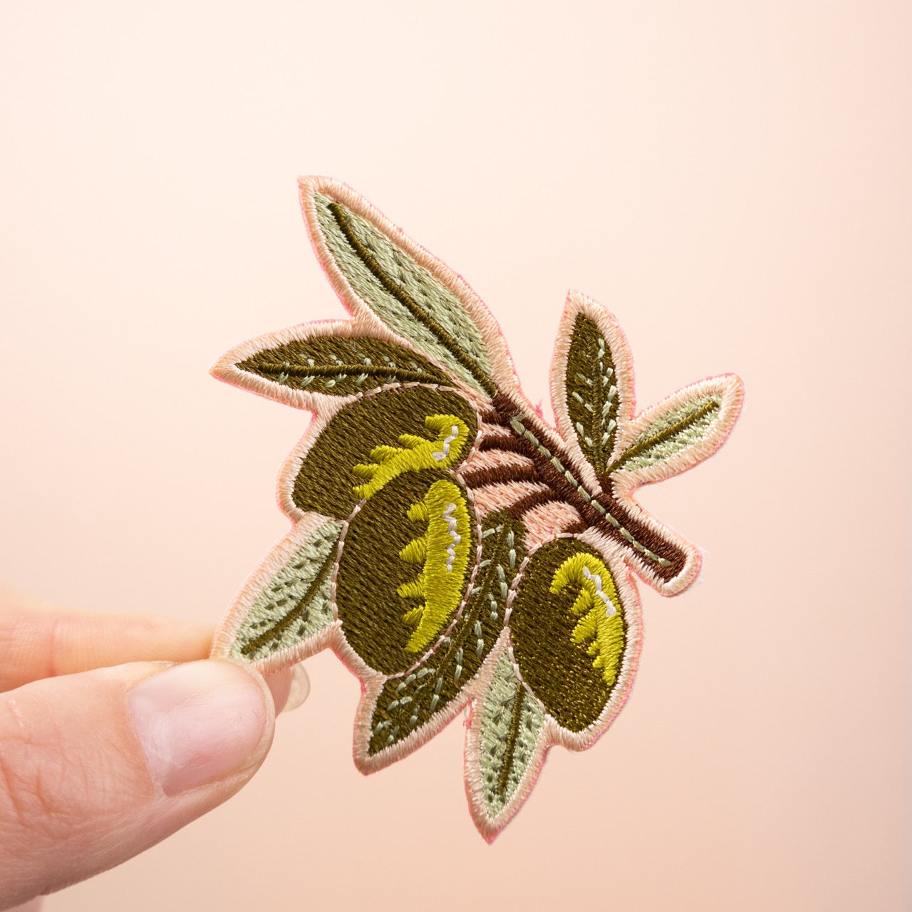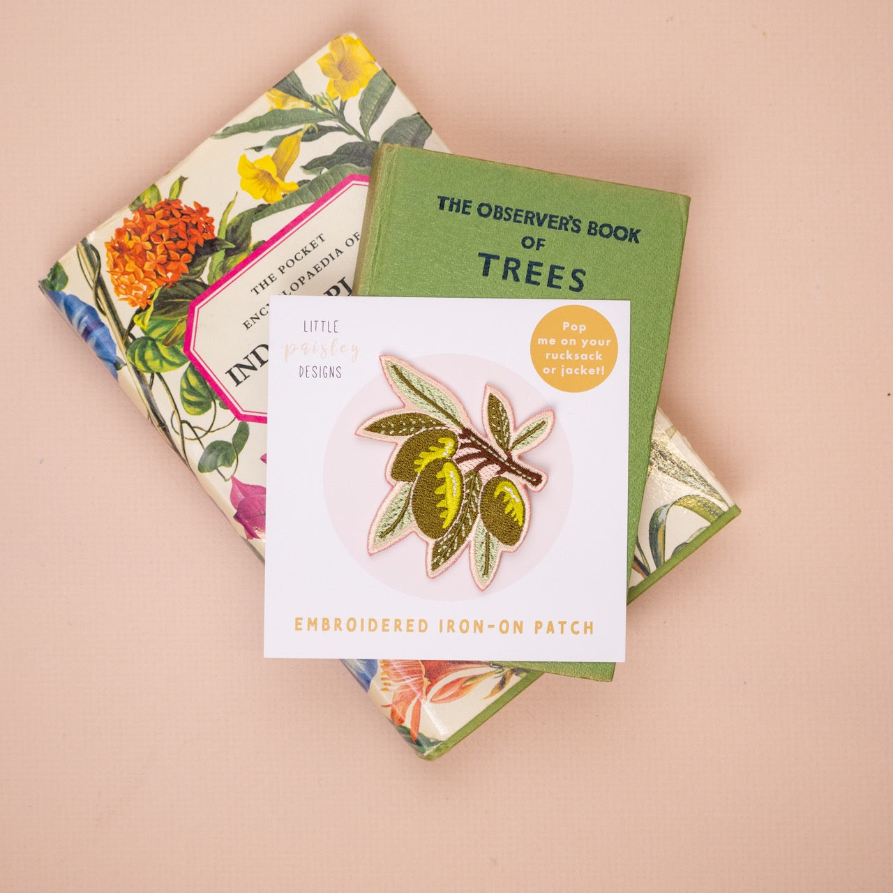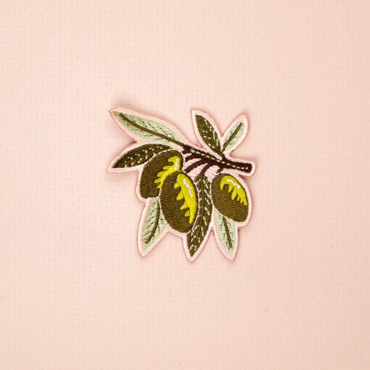 A delicate and colourful Olive embroidered patch. This botanical iron-on patch features a 3 juicy Kalamata olives and leaves with a complementary peachy pink border, which makes it really stand out. This lovely little Olive patch will cheer up a jacket or bag with its delicate embroidered green hues. The design comes from an original watercolour painting by illustrator Eleanor Longhurst from our 2025 botanical calendar. Pop it on a t-shirt, rucksack or jacket to jazz up your outfit! Simply Iron on and the patch will be permanently held in place! Each patch has an adhesive backing, which is secured by ironing on.