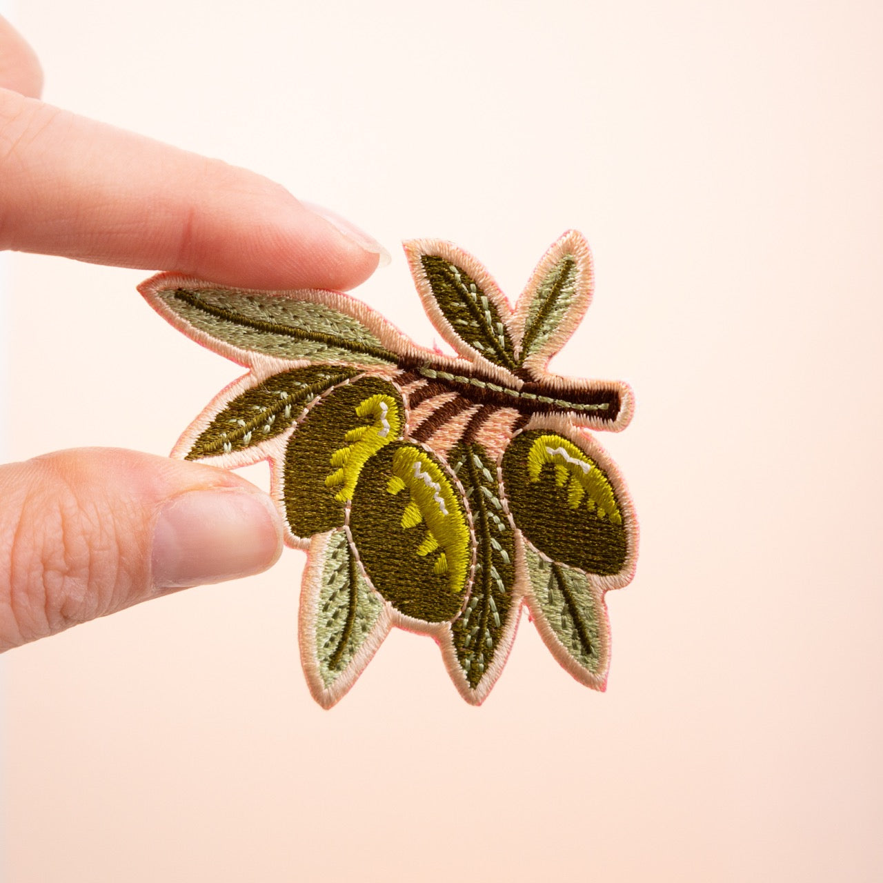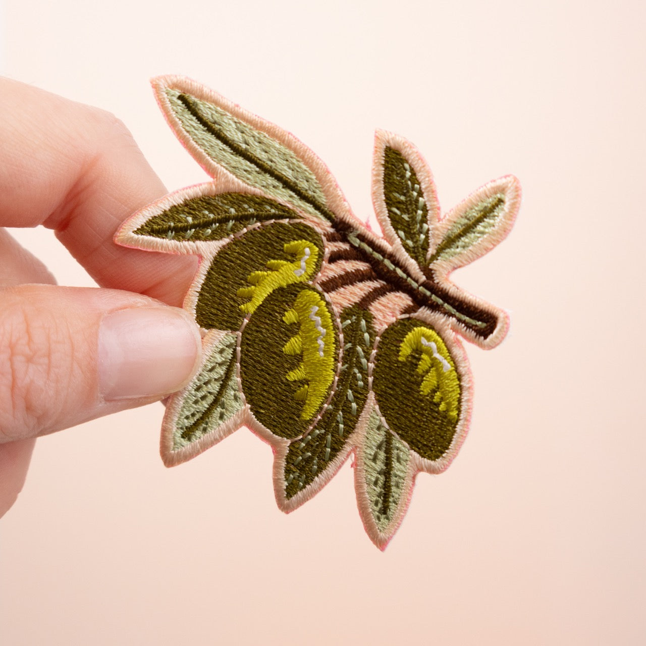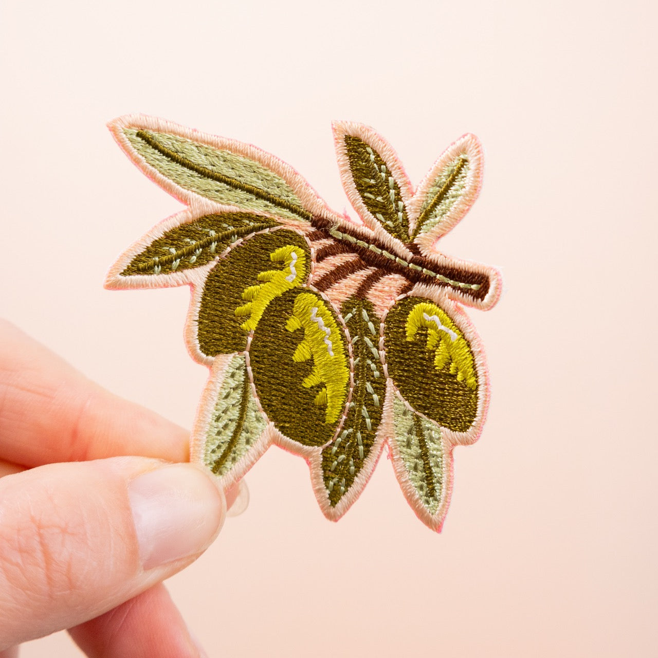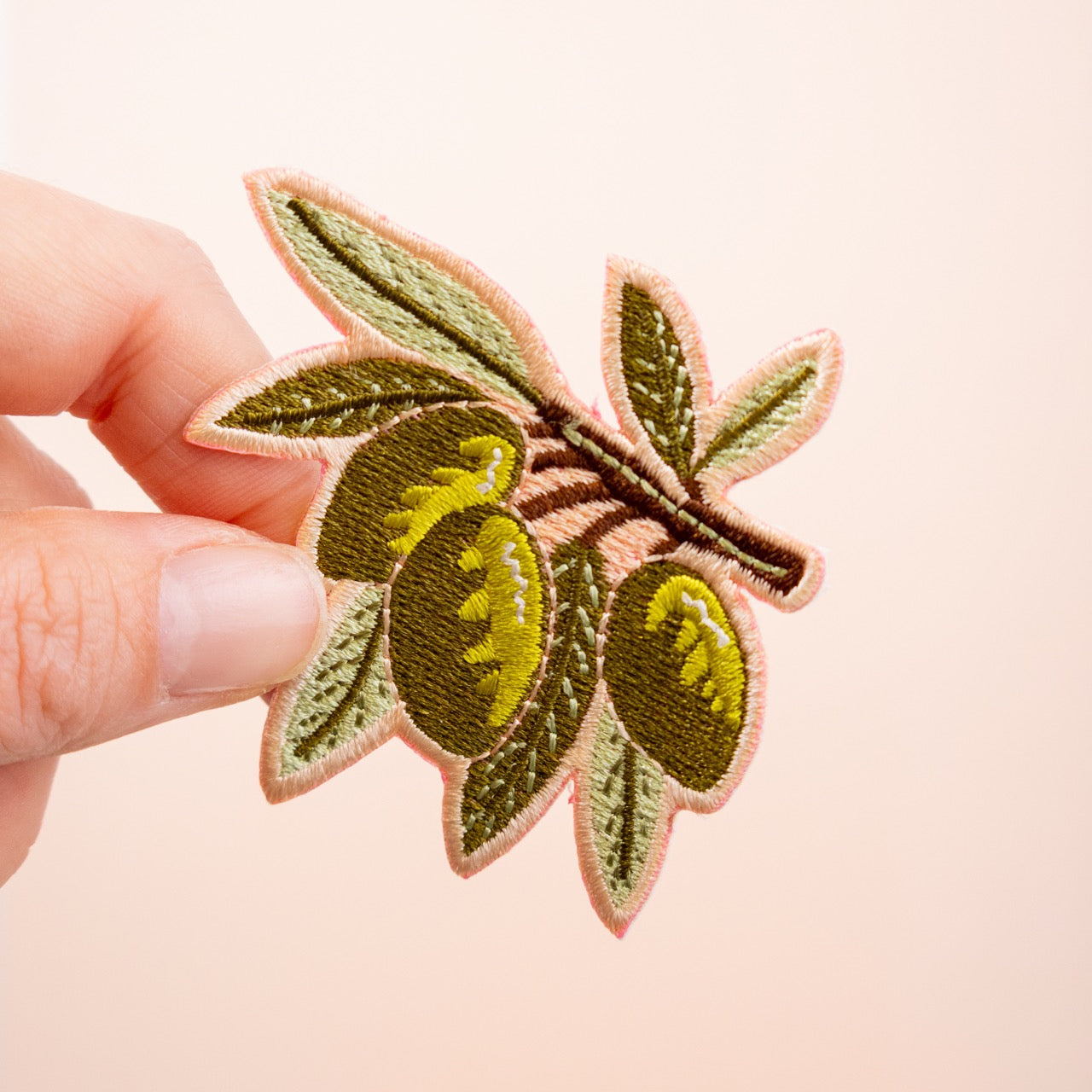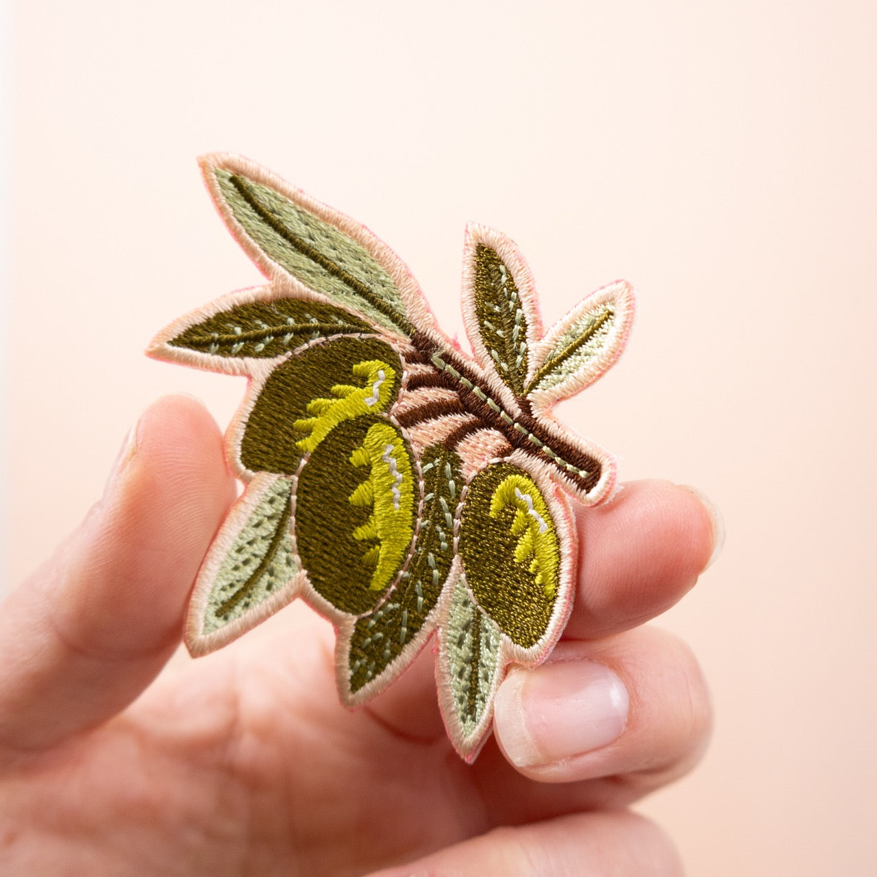 A delicate and colourful Olive embroidered patch. This botanical iron-on patch features a 3 juicy Kalamata olives and leaves with a complementary peachy pink border, which makes it really stand out. This lovely little Olive patch will cheer up a jacket or bag with its delicate embroidered green hues. The design comes from an original watercolour painting by illustrator Eleanor Longhurst from our 2025 botanical calendar. Pop it on a t-shirt, rucksack or jacket to jazz up your outfit! Simply Iron on and the patch will be permanently held in place! Each patch has an adhesive backing, which is secured by ironing on.