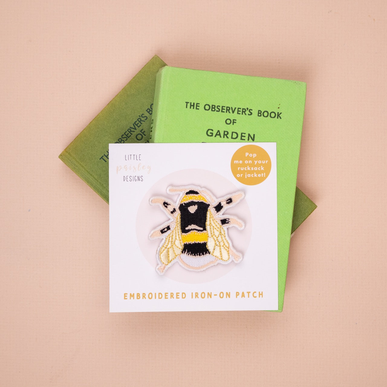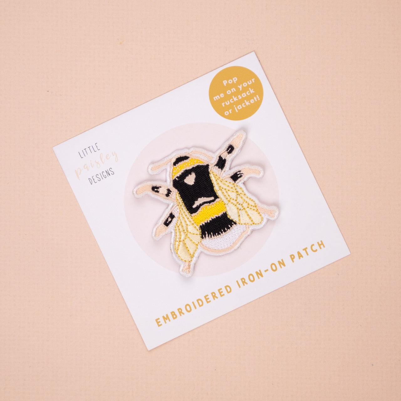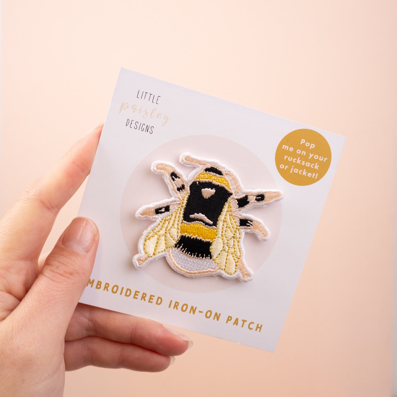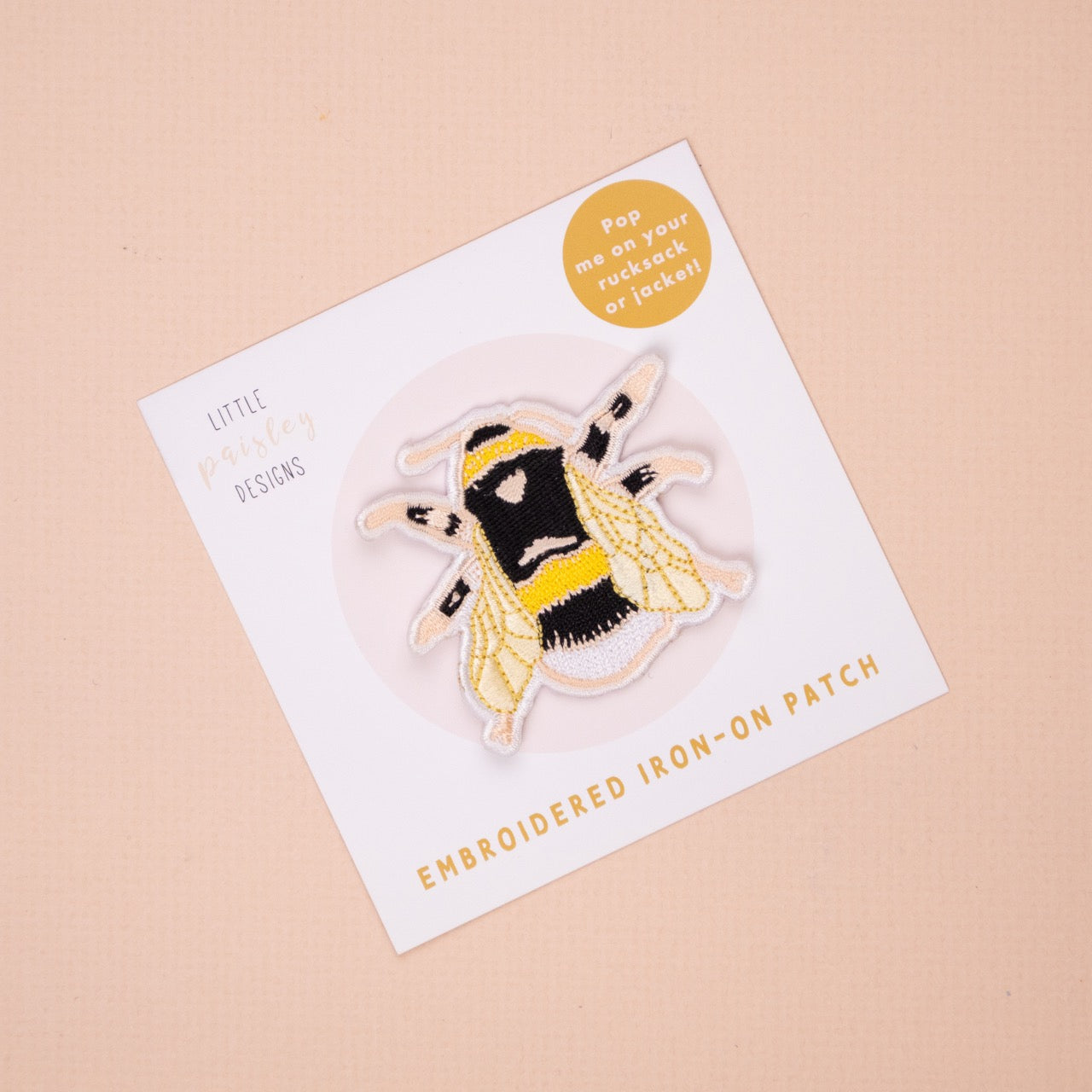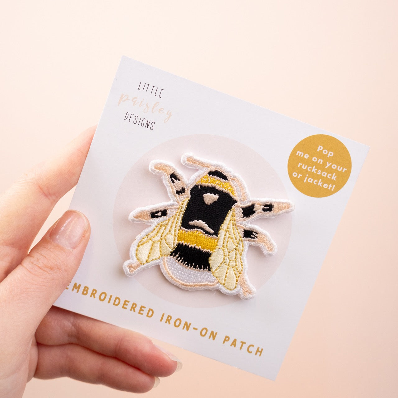 A beautiful British Bee Patch. An embroidered iron-on patch, perfect for customising your clothing! This lovely little bee will cheer up your jacket or bag, and bring a pop of colour to your outfit. Pop it on a t-shirt, rucksack or jacket to jazz up your outfit! Simply Iron on and the patch will be permanently held in place! Each patch has an adhesive backing, which is secured by ironing on. An embroidered iron-on patch, based on a watercolour illustration of a White-Tailed Bumble Bee by Illustrator Eleanor Longhurst.