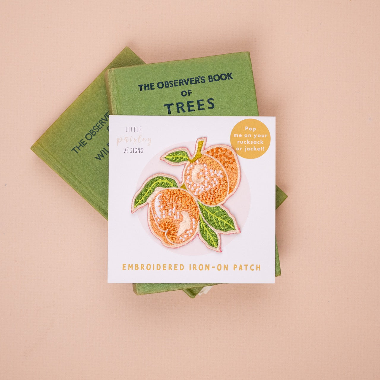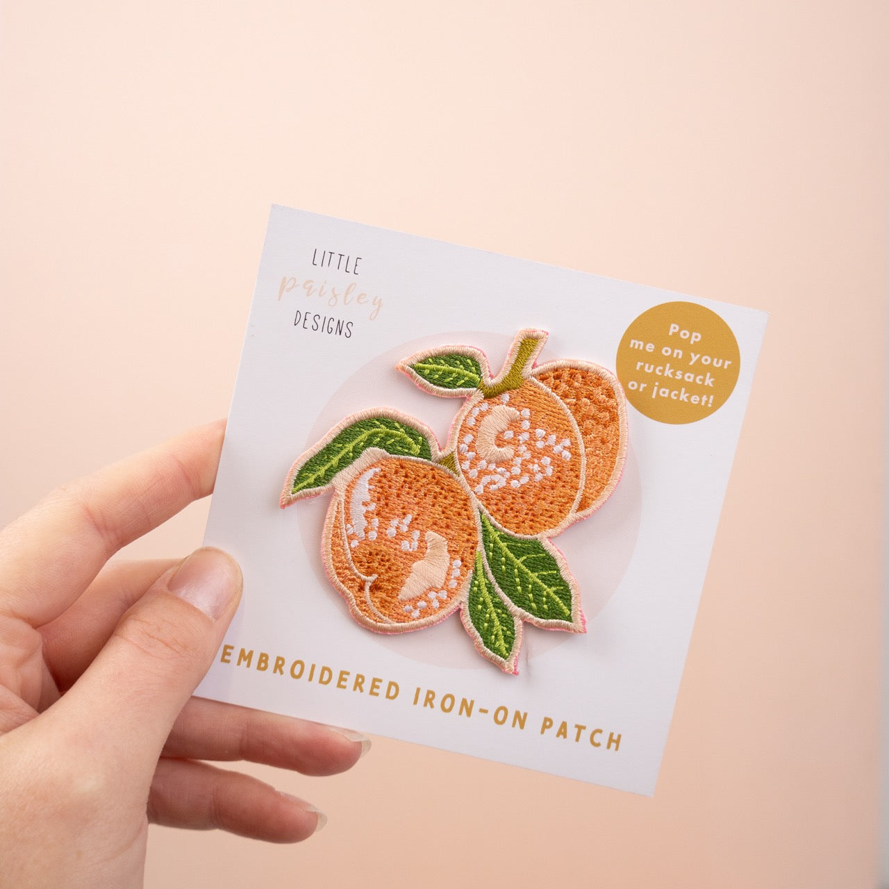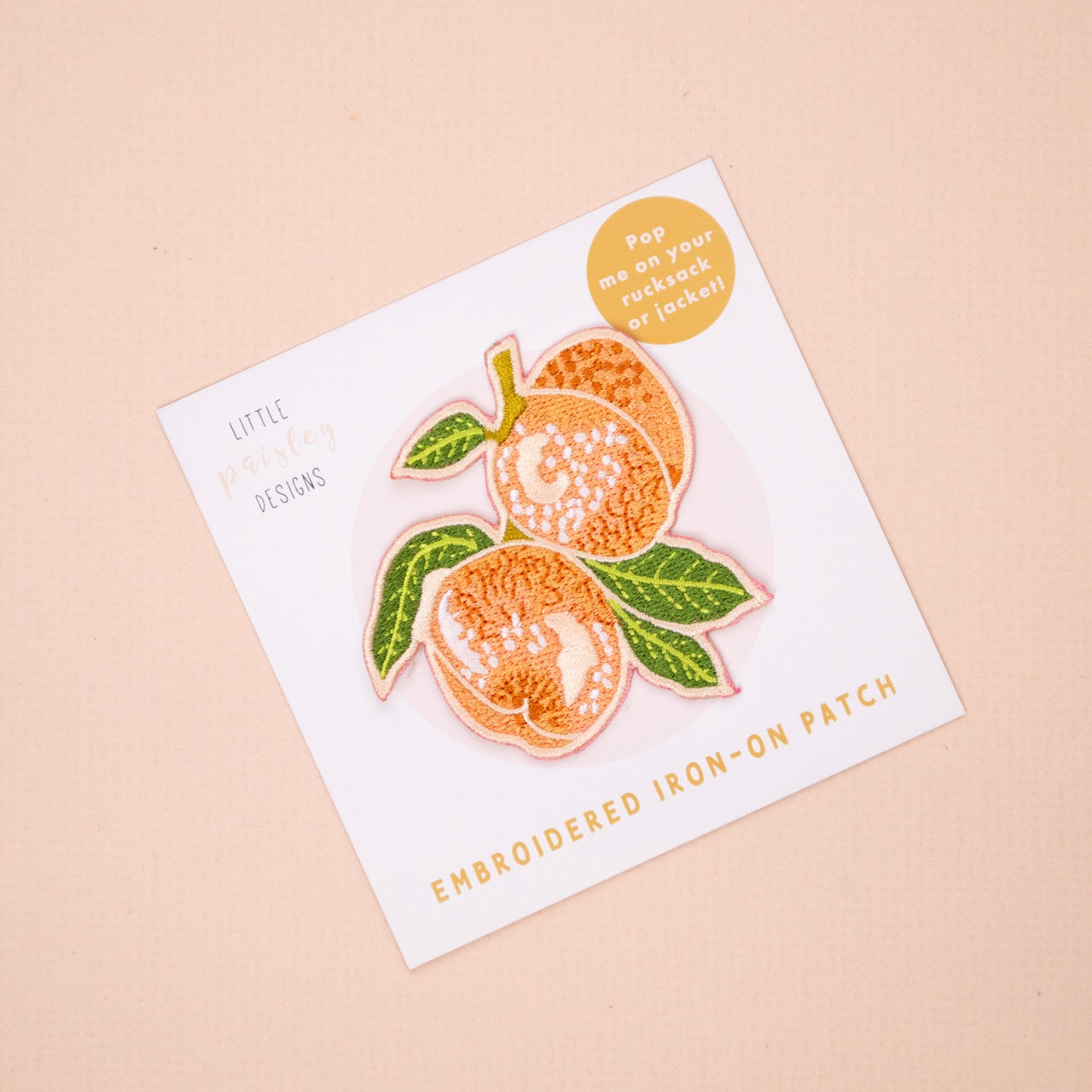 A colourful, fruity Peach embroidered patch. This iron-on patch features a pair of juicy peaches and leaves with a complementary peachy pink border, which makes it really stand out. This delicate Peachy patch will cheer up a jacket or bag. The design comes from an original watercolour painting by illustrator Eleanor Longhurst from our 2025 botanical calendar. Pop it on a t-shirt, rucksack or jacket to jazz up your outfit! Simply Iron on and the patch will be permanently held in place! Each patch has an adhesive backing, which is secured by ironing on.