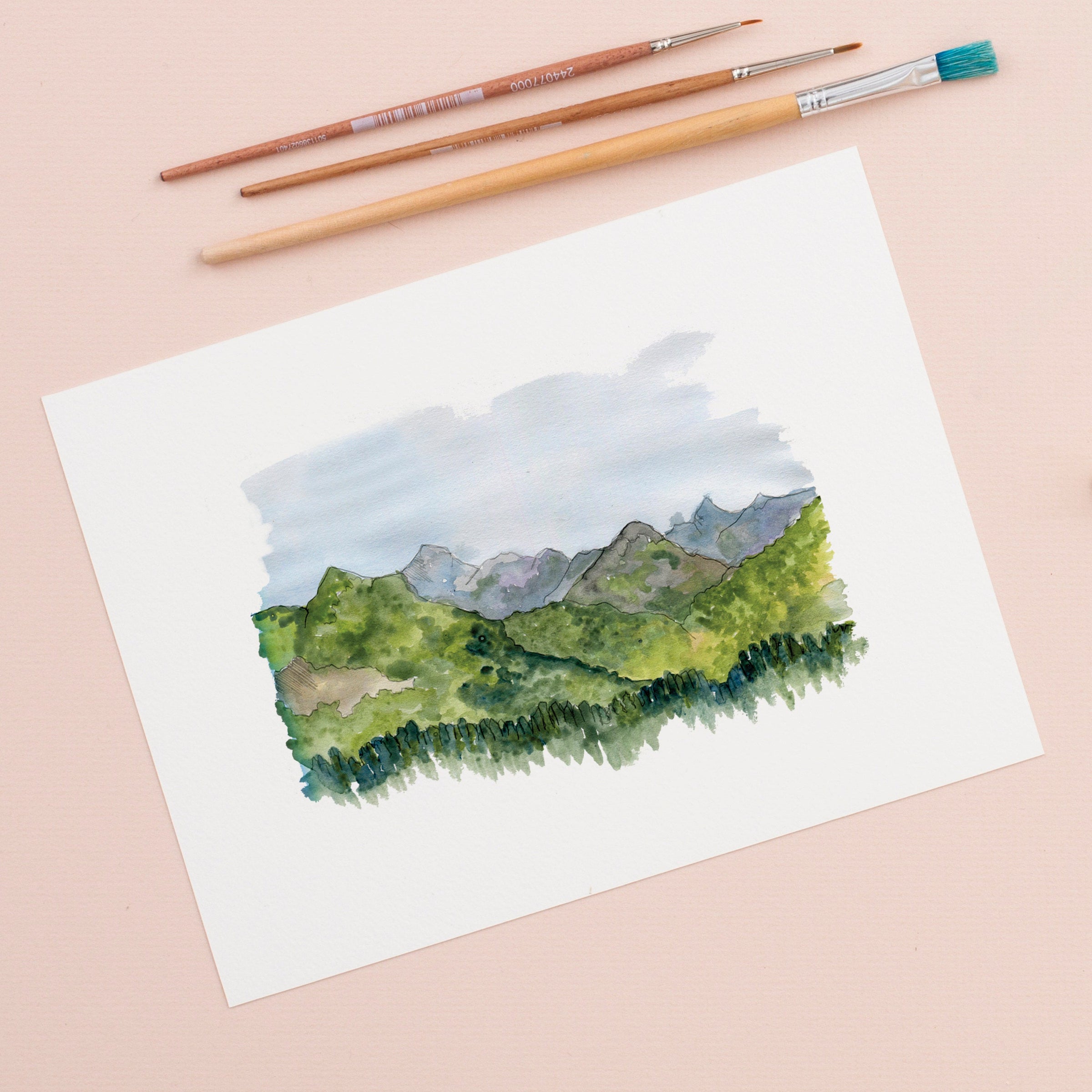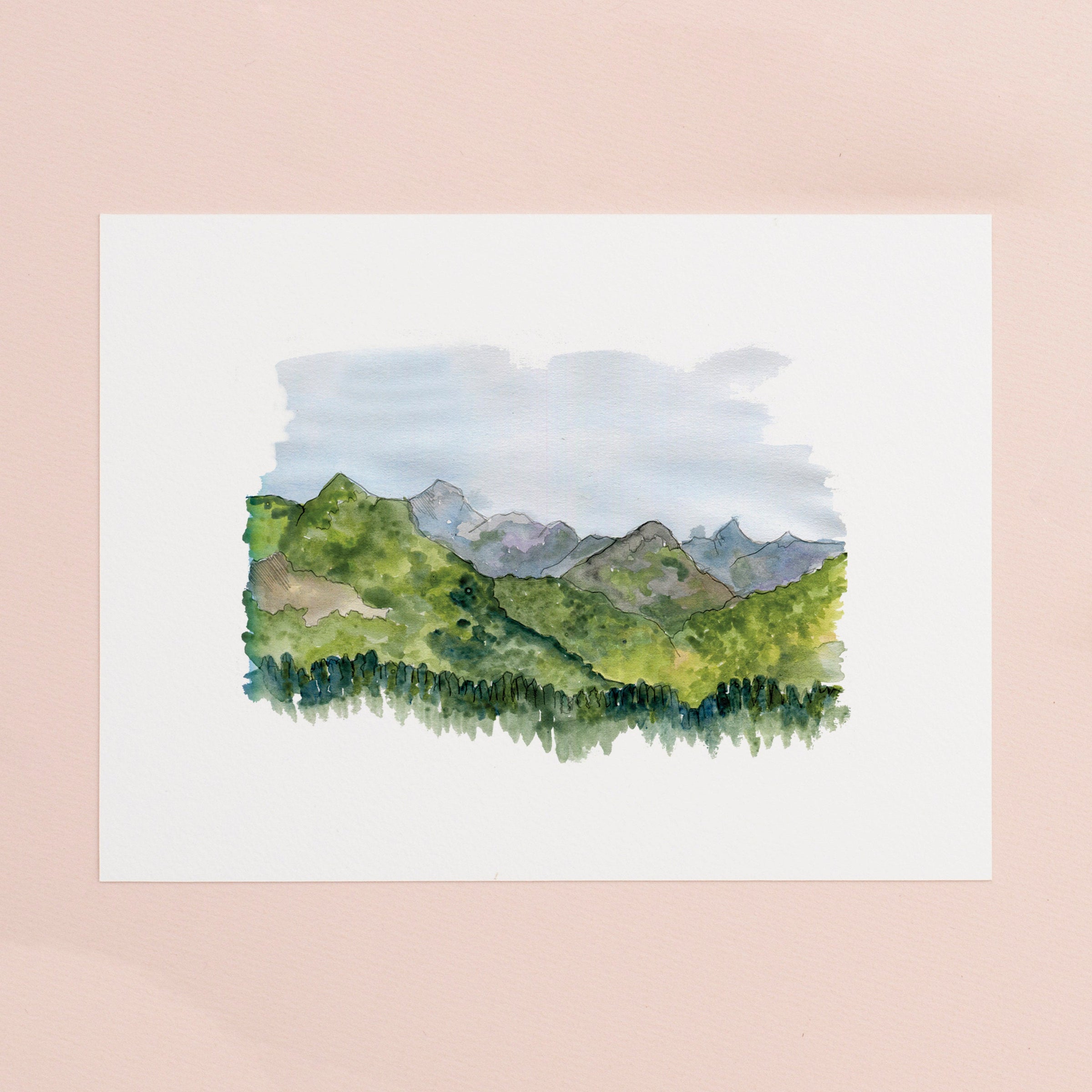 Longing for the hills? Fancy a sound of music moment? This beautiful Giclée print of an Alpine Mountain Landscape will add a touch of nostalgic charm to your home. Originally painted using watercolours on location in The Austrian Alps. This colourful landscape print would make a great gift for someone that loves the outdoors. Perfect for evoking wanderlust! The soothing green and blue tones would complement a gallery wall.